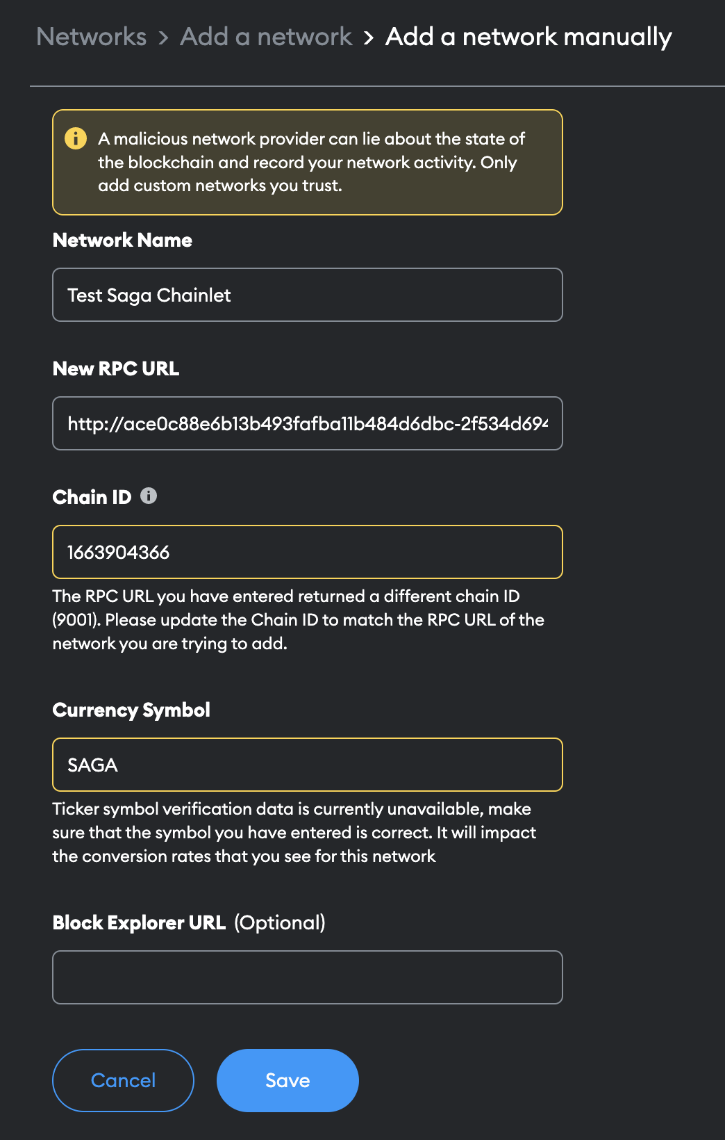 Make sure you are using the evm information as config for metamask. You can also Metamask to localhost after running saga chainlet connect test.